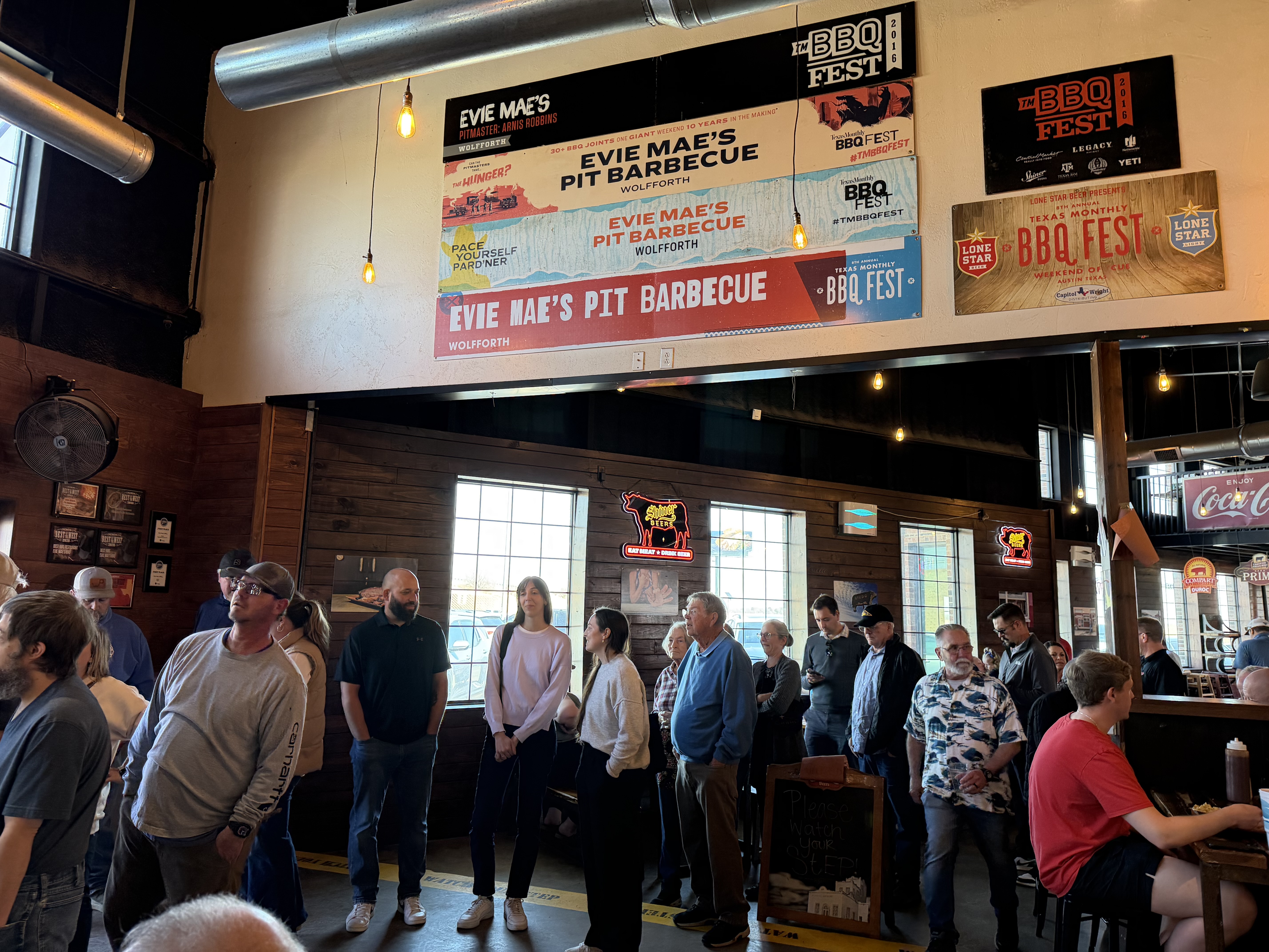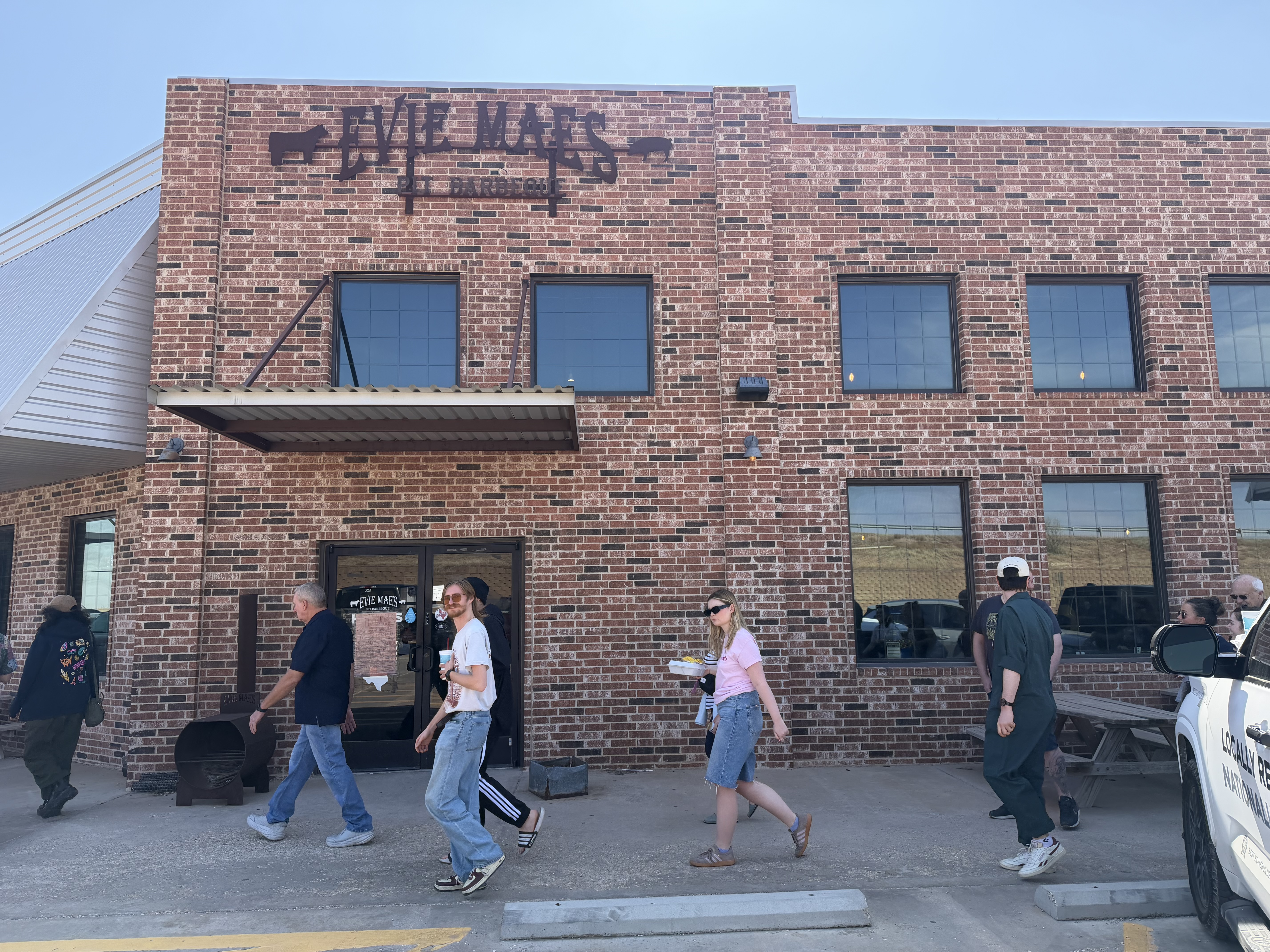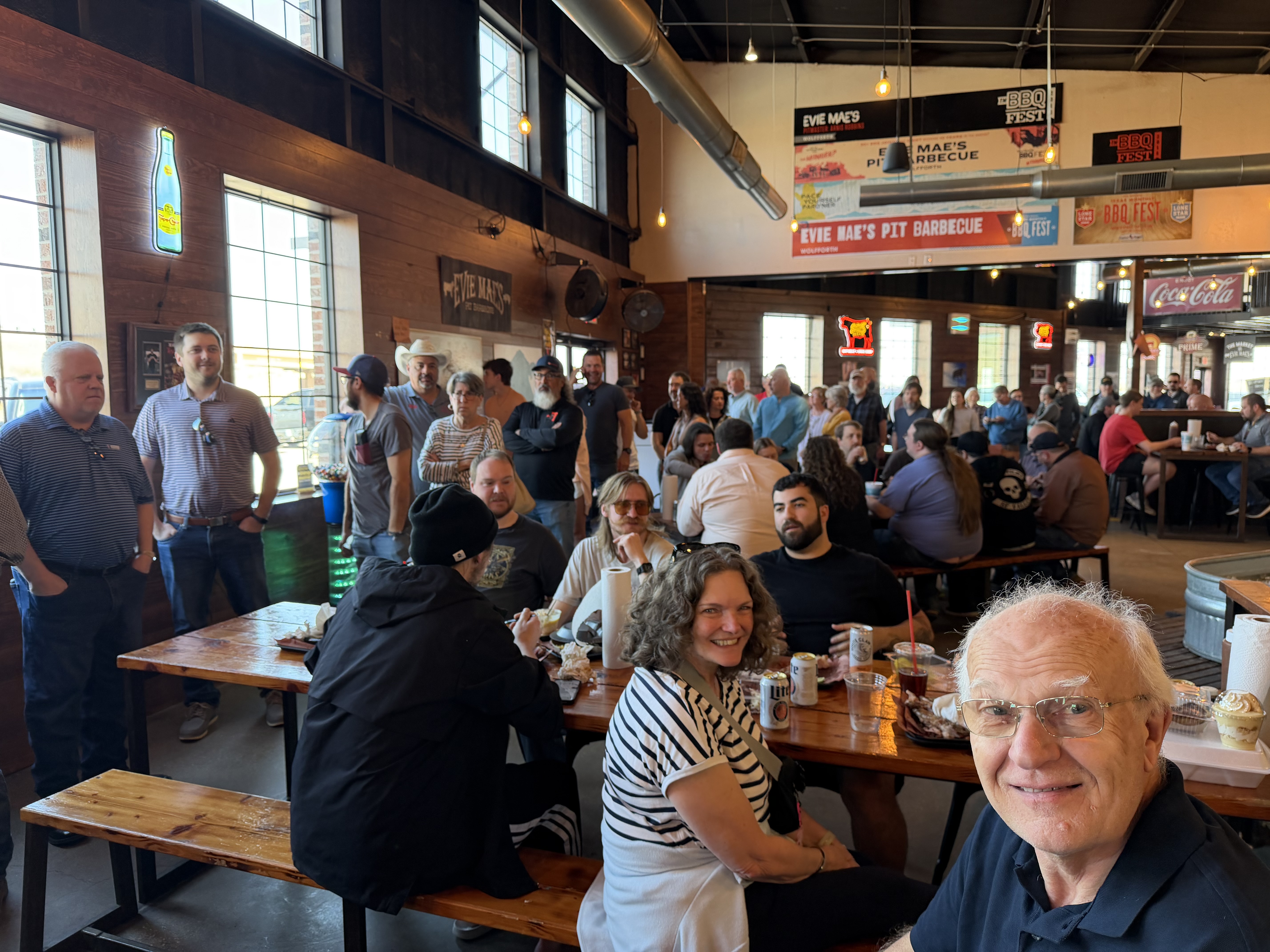 Day off with day rooms. I missed breakfast as it finished at 9am and we are not supposed to have alarms in the bunks. It was the first one which had a freshly cooked egg station too! However, we had a trip out to a BBQ place, in one of the buses, leaving at 11.30 so I wouldn’t have managed breakfast and the huge amount of food there as well. Jackson, our tour manager, used to live in Lubbock so wanted us all to experience Evie May’s. It was fun. A long queue (line) up to the counter where we ordered and one lady got sandwiched between two groups of us. We got chatting and she was lovely, bowled over by the Peppa Pig connection and that we are all English, as usual, which is always quite heartwarming. She had the most fabulous Texan accent, straight out of “Dallas”. We spotted a few stetsons too! Lovely BBQ meats, corn bread, pickles… and free beer!