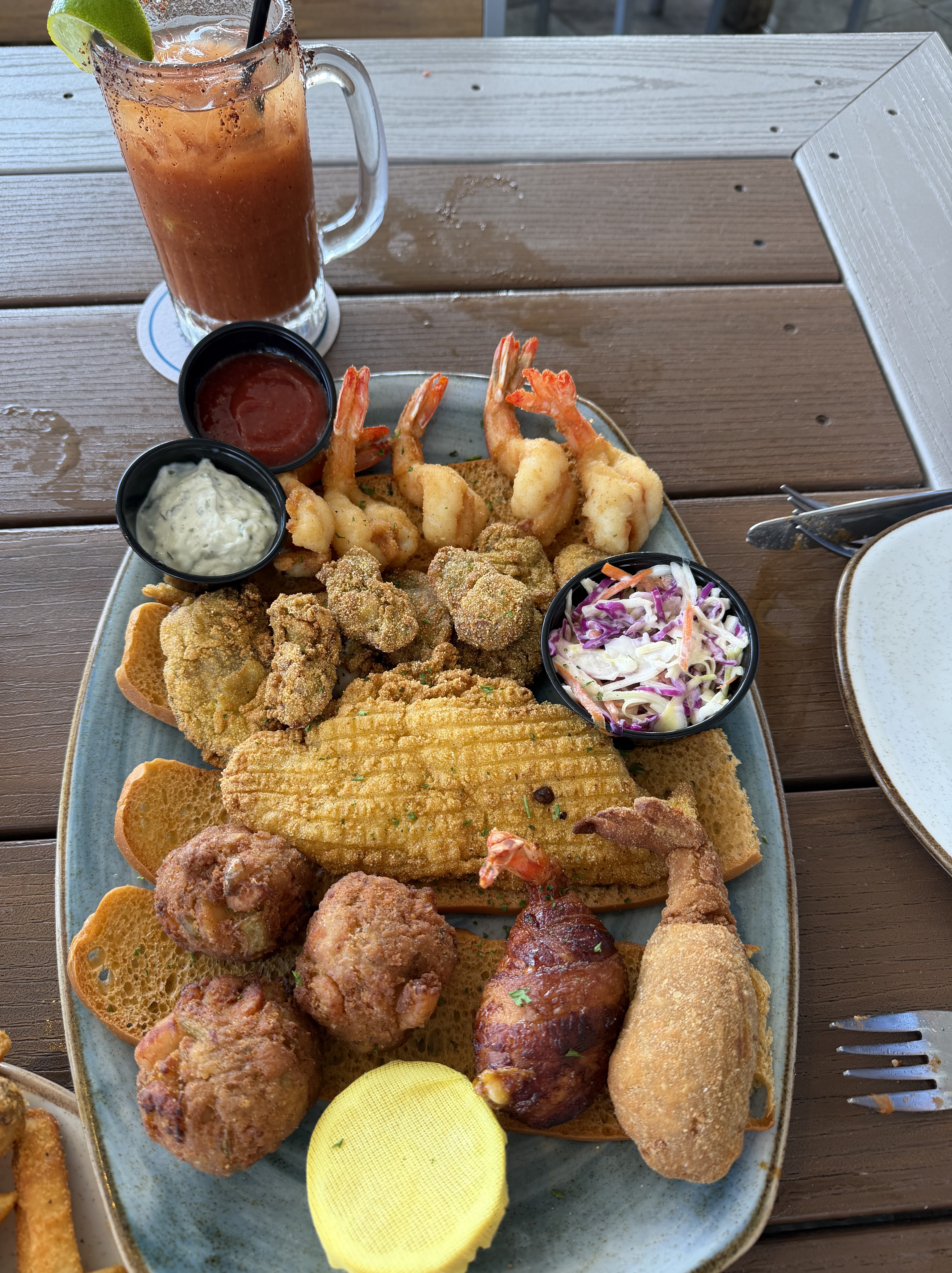 We had a decent gap between shows so walked down to the seafront on the Gulf side – about half an hour – past more pretty buildings. There was a beautiful large hotel on the front. It is a very long beach and the surf was quite rough. Brown pelicans were soaring overhead and laughing gulls on the beach. We walked a long way down the sea front, past the huge pleasure beach with a fearsome looking rollercoaster, and ate at a restaurant which was recommended in the Lonely Planet guide, Nick’s Kitchen (which apparently doesn’t do the “fancy pants stuff” its sister reaturant, Gaido’s does!) We shared Calamari and a seafood platter with two Bloody Marys (shocking, before a show!!!). We usually have theatre catering (often brought in from a local restaurant) with one meal provided per show. This theatre did a catering buy-out, which means we get cash instead to buy our own food. Perfectly timed for our seafood treat! Then we dashed back to the theatre for the second show. They were both lively audiences which was good.
