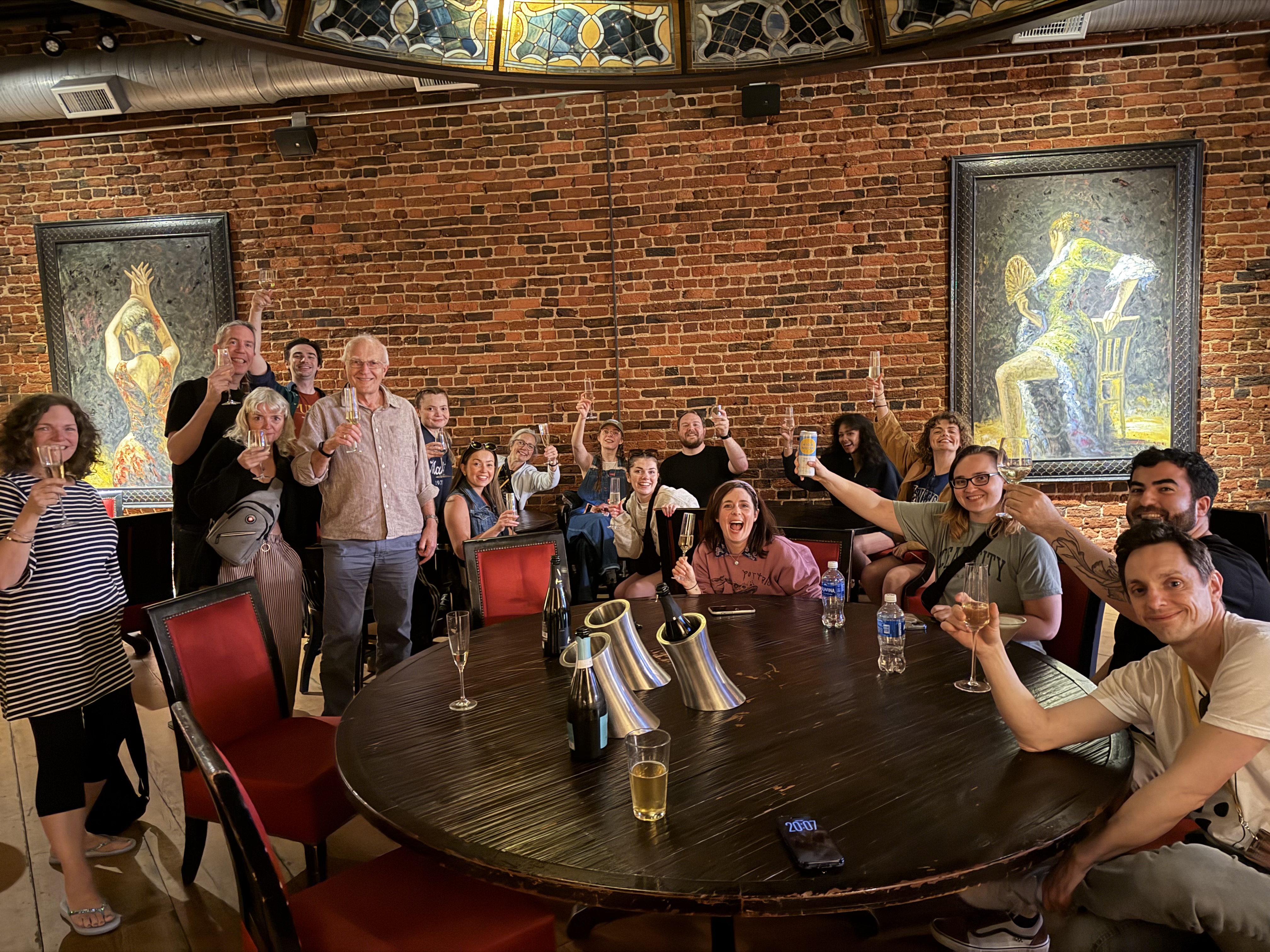 We adjourned to a bar where Graham bought fizz for everyone, to celebrate the arrival of granddaughter, Emilia! We also had a “round table” session of Traitor’s – at an actual round table!