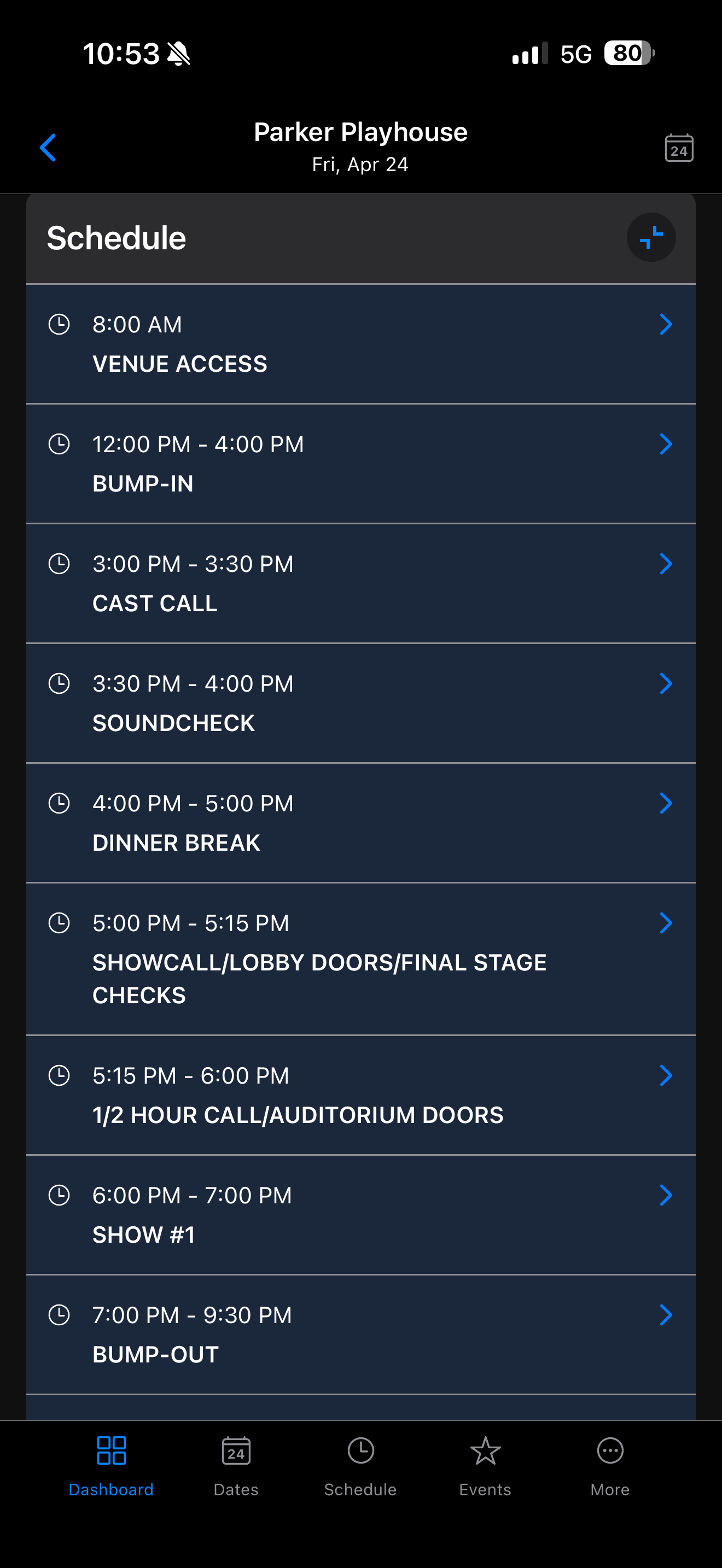 One of the things we will miss is our daily schedule – we never have to think for ourselves! Jackson also sends a video of where to find Stage Door from where the buses are parked, then which corridor we need for dressing rooms, stage, catering, green room, laundry… It gets confusing being in a different theatre every day so this is really helpful. Then at soundcheck, Jackson gives us the rundown of the shows that day and any other information such as if there is a dark stage (no access) at any time. This is the time for any queries too. Heaven knows how we will all cope without it when we get back home!